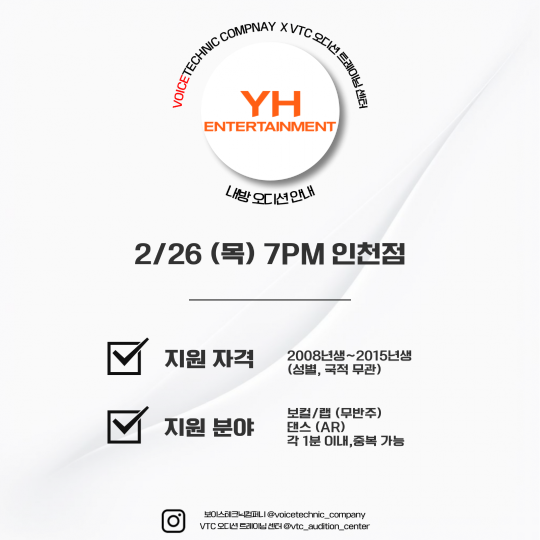 내방 오디션 정보 2026 / 143번째 내방오디션 - YH엔터테인먼트 작성자관리자 등록일 26-01-23 조회73회 본문 2026 / 143번째 내방오디션 - YH엔터테인먼트 2026 / 144번째 내방오디션 - 초코엔터테인먼트 2026 / 142번째 내방오디션 - S2엔터테인먼트 목록