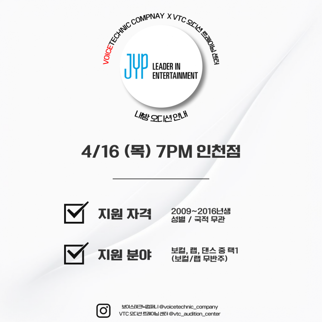 내방 오디션 정보 2026 / 150번째 내방오디션 - JYP엔터테인먼트 작성자관리자 등록일 26-02-13 조회95회 본문 2026 / 150번째 내방오디션 - JYP엔터테인먼트 오디션 합격생 전체 명단 *2025.05.15 2026 / 149번째 내방오디션 - FNC엔터테인먼트 목록